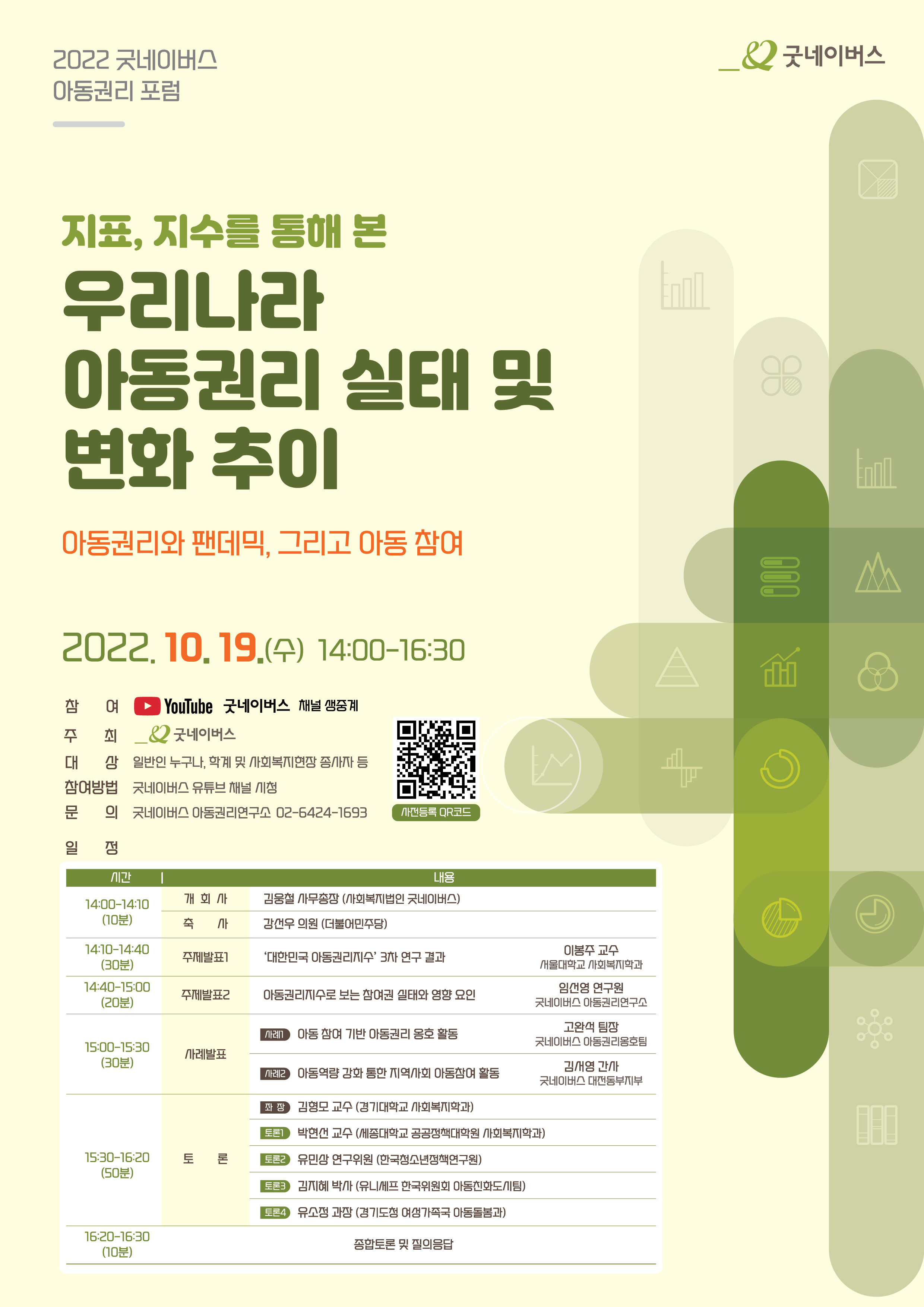 아동권리연구소에서는 2022 굿네이버스 아동권리 포럼을 지표, 지수를 통해 본 우리나라 아동권리 실태 및 변화 추이 - 아동권리와 팬데믹, 그리고 아동 참여라는 주제로 개최합니다.
