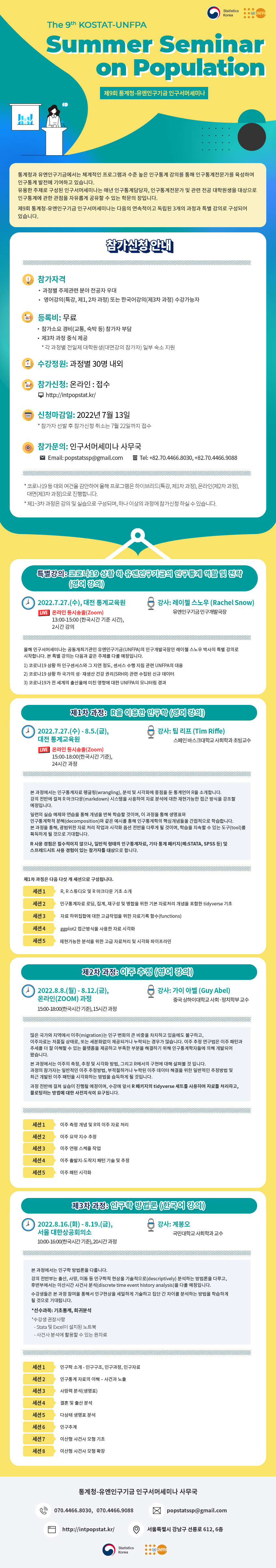 2022년 인구서머세미나는 연속적이고 독립적인 세 개의 과정, 'R을 이용한 인구학', '이주 추정', '인구학 방법론'과 '코로나19 상황 하 유엔인구기금의 인구통계 역할 및 전략'을 주제로 한 특별 강의로 구성되어 있으며, 코로나19 등 대외 여건을 감안하여 하이브리드(특강, 제1차), 온라인(제2차), 대면(제3차)강의로 진행합니다.