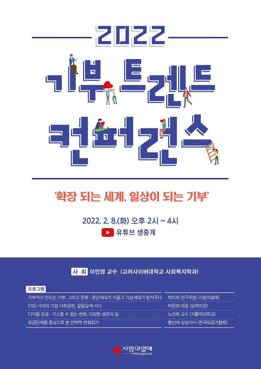 사랑의열매 나눔문화연구소에서 주최하는 ‘2022 기부 트렌드 컨퍼런스’가 오는 2월 8일 14:00 온라인으로 열립니다.