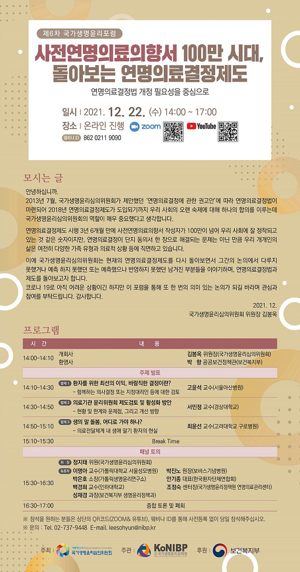 ○ 포럼에 유튜브를 통해 참여하시고자 하는 경우: 1) 초청장의 유튜브 QR코드 스캔하여 참여 2) 아래 링크로 바로 참여 : https://www.youtube.com/channel/UCPkZ1AVMaOhYcYS8Ws828RA 3) 유튜브에 '국가생명윤리정책원' 채널 검색하여 참여