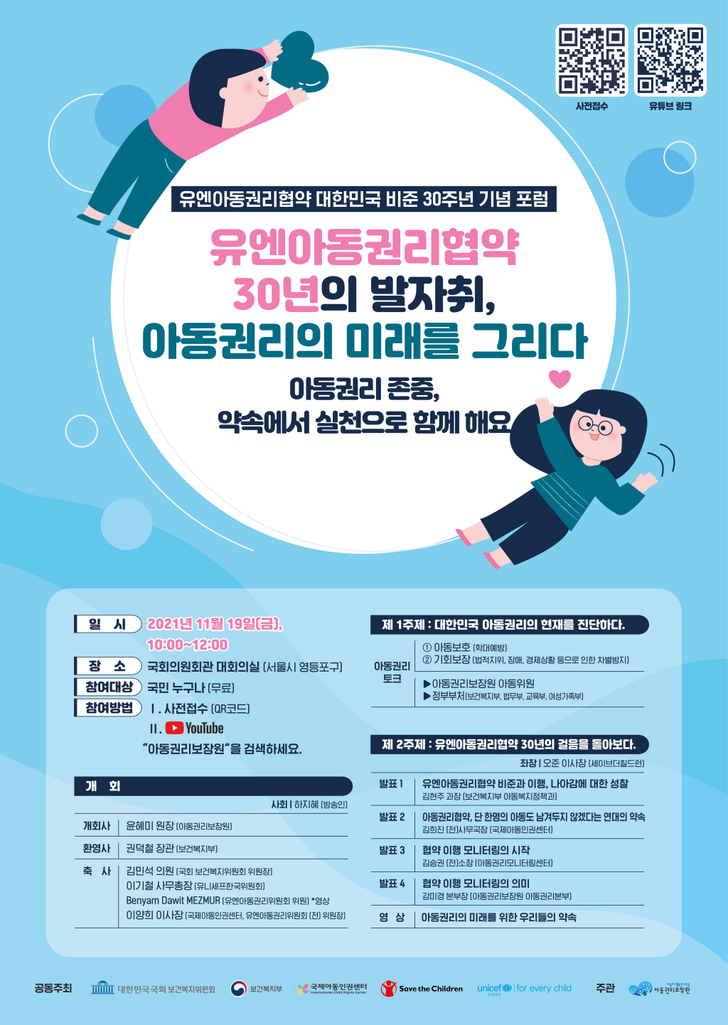 주 제 : 유엔아동권리협약 대한민국 비준 30주년 기념 포럼 「유엔아동권리협약 30 , 년의 발자취 아동권리의 미래를 그리다」,