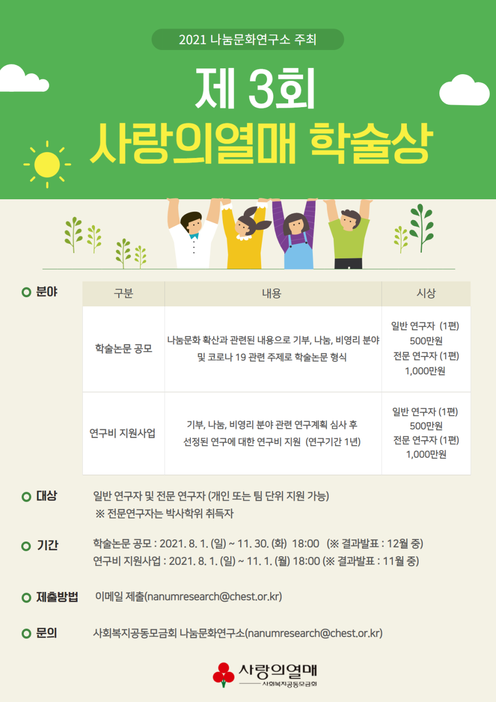 사랑의열매 사회복지공동모금회에서는 나눔문화의 확산을 위해 제3회 사랑의열매 학술상을 공모하고자 합니다.