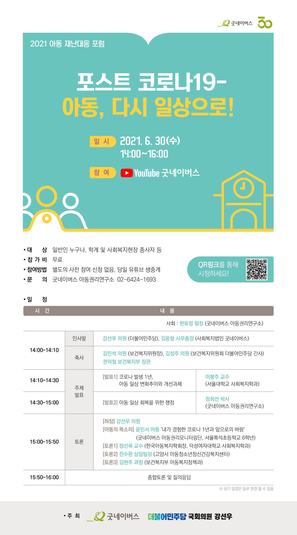 1. 주 제 : 포스트 코로나19 - 아동, 다시 일상으로! 2. 일 시 : 2021년 6월 30일(수요일) 14:00~16:00 3. 진 행 : 굿네이버스 유튜브 실시간 중계 4. 링 크 : https://www.youtube.com/user/GoodNeighborskr 5. 문 의 : 굿네이버스 아동권리연구소(02-6424-1693) 6. 기 타 - 별도의 사전접수와 참가비 없음 - 자료집은 6월 30일(수) 행사 당일 굿네이버스 유튜브 더보기란에서 다운받으실 수 있습니다. - 아래 포럼 포스터의 QR링크를 통해서도 유튜브 시청이 가능합니다. |