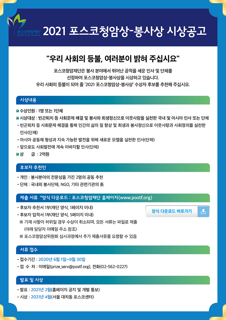 [포스코청암재단]2021 포스코청암상-봉사상 시상공고